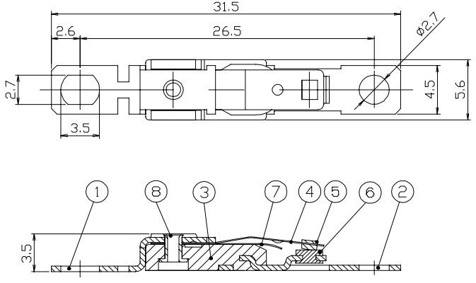 尺寸單位:mm寬5.6 x長31.5 x高3.5mm每個孔之間的距離:26.5mm孔徑:2.7mm