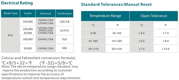 KI31&KSD301 series snap-action thermostat is a small size bimetal thermostat with a metal cap which belongs to thermal relays' family. The principle is one function of bimetal discs is snap action under the change of the temperature. The snap action of the disc can push the action of the contact through the structure inside, then cause on or off on the circuit. The main characteristic are the fixation on working temperature, reliability of the snap-action, less flashover and long life span.
